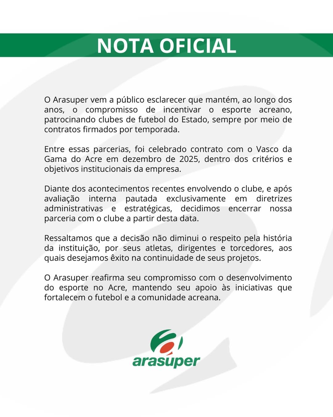 A perda do patrocínio master representa um golpe financeiro duríssimo para o Vasco-AC, que já enfrenta o desgaste de imagem e o afastamento de sua base de apoio. O Arasuper reforçou que continuará incentivando o esporte local, mas que, neste momento, o apoio ao “Almirante” não é mais viável dentro dos critérios institucionais da empresa.