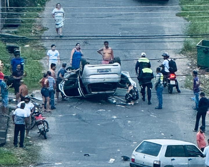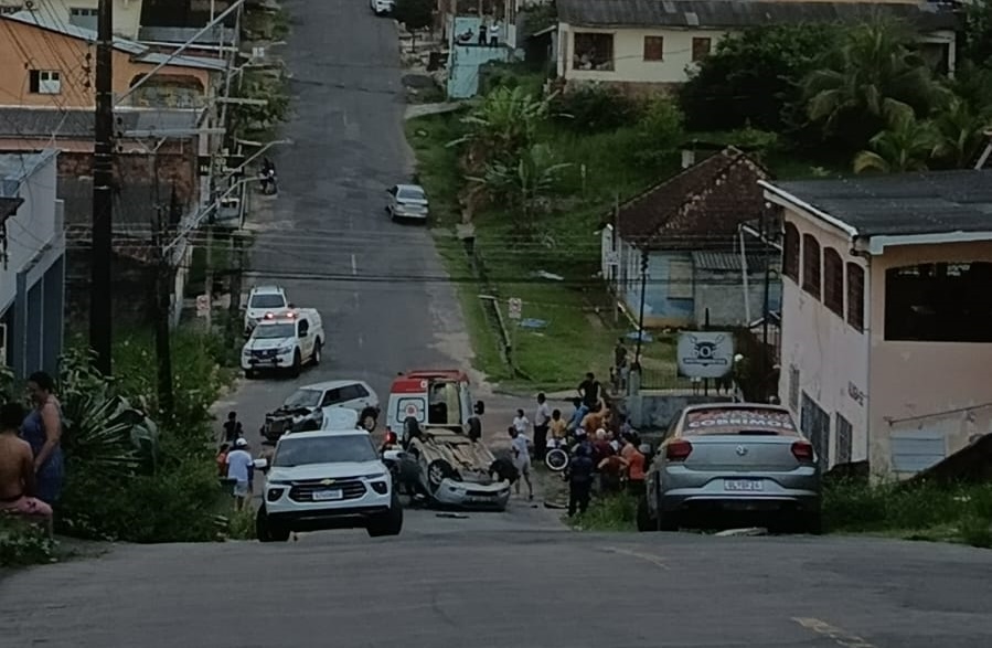 Com o impacto da colisão, um dos carros teve a parte frontal completamente destruída. O outro veículo capotou e ficou parado no meio da ladeira, chamando a atenção de quem passava pelo local.