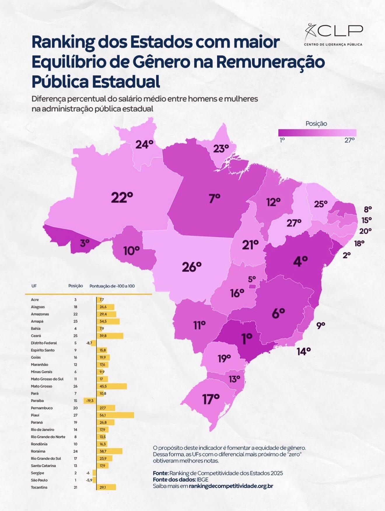 Na outra ponta da lista está o Ceará, que aparece na última colocação com pontuação de 39,8, indicando maior diferença entre os salários médios pagos a homens e mulheres na administração pública estadual.