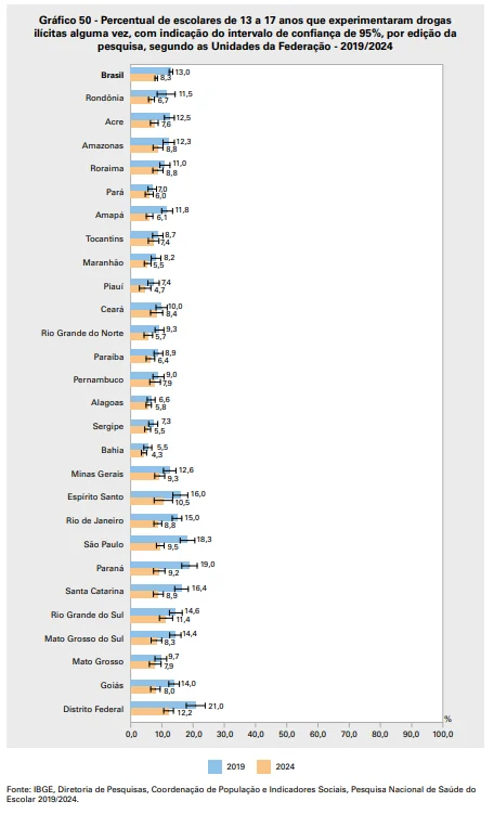 Em um dos pontos da pesquisa, o IBGE perguntou se os adolescentes já experimentaram drogas ilícitas alguma vez na vida. O Acre aparece em 16º lugar no ranking, com 7,6%. Em 2019, este mesmo índice era de 12,5%. Na pesquisa aparece, ainda, o percentual de adolescentes de 13 a 17 anos que fumaram cigarro alguma vez. O Acre teve o percentual mais alto em 2024, de 28,9%, junto com o Mato Grosso do Sul (27,7%).