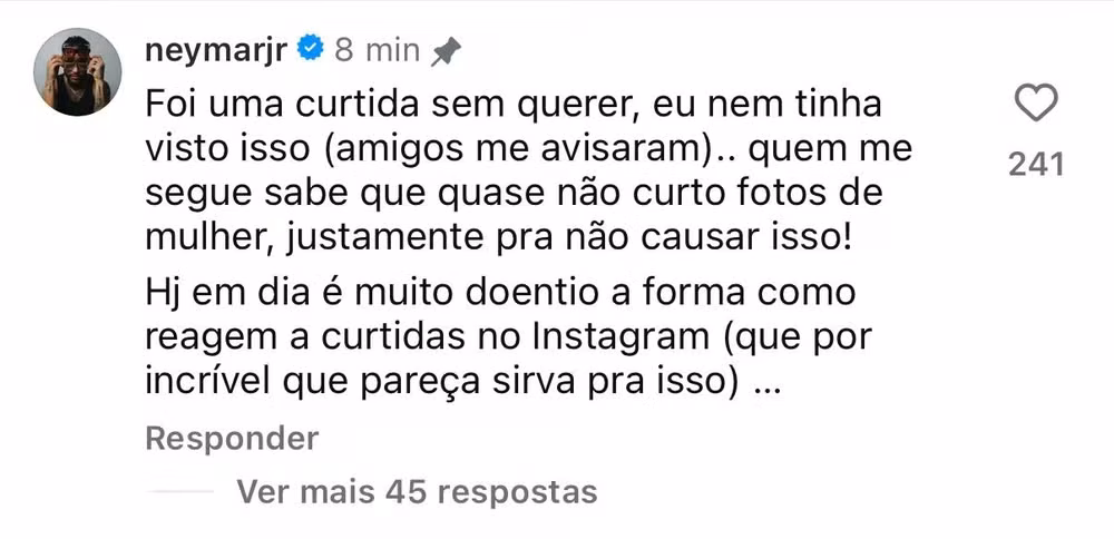 “Foi uma curtida sem querer. Quem me segue sabe que quase não curto fotos de mulher, justamente para não causar isso”, justificou o jogador do Santos.