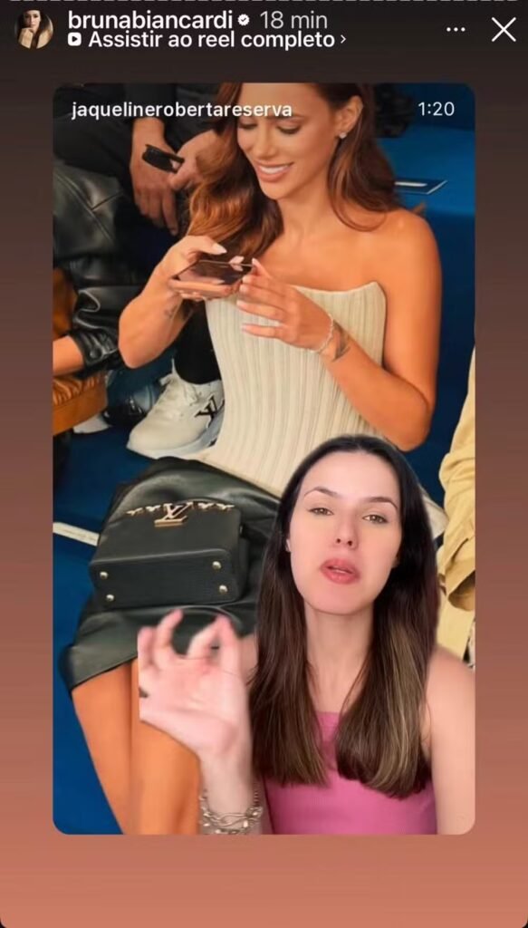 No vídeo, Jaqueline destaca que, enquanto os “burburinhos” no Brasil giram em torno das curtidas de Neymar nas redes sociais, Bruna tem marcado presença na primeira fila de desfiles de grandes grifes durante a temporada de moda na capital francesa, como a Louis Vuitton. A influenciadora também compartilhou registros dos eventos e dos looks escolhidos para as ocasiões.