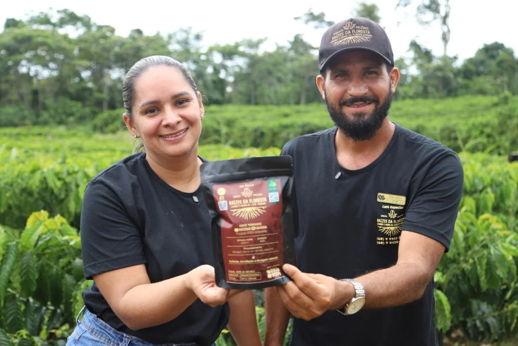 A história do casal Keyti Kety Souza e Jorge Souza, cafeicultores da Reserva Extrativista Chico Mendes, é um exemplo de empreendimentos que nasceram durante a pandemia de Covid-19. Foi nesse cenário que eles decidiram apostar em algo novo para eles: o plantio de café em uma área de extrativismo.
