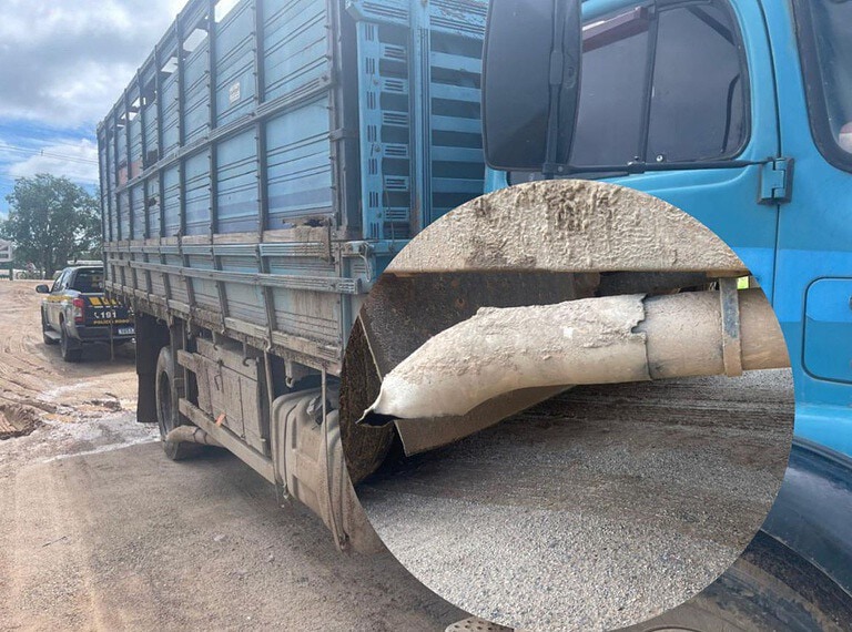 Após a inspeção, a equipe constatou que o caminhão não possuía silenciador no sistema de escapamento. A ausência do equipamento impede o controle dos níveis de ruído e também das emissões de gases.