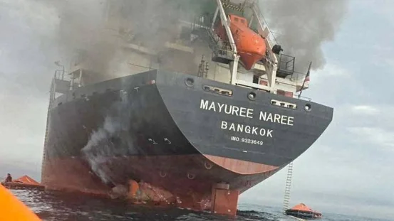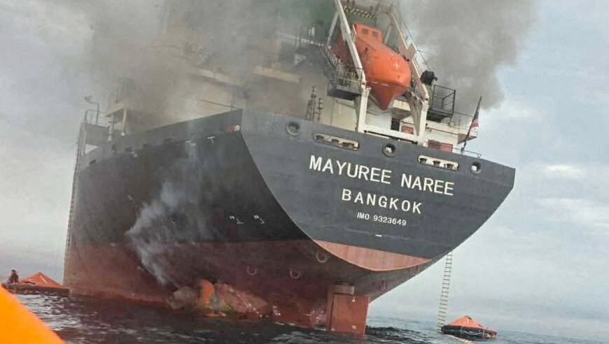 O navio cargueiro Mayuree Naree, com bandeira da Tailandia, foi tomado por uma densa fumaça negra no Estreito de Ormuz (Foto: Marinha Iraniana/Distribuição via REUTERS)