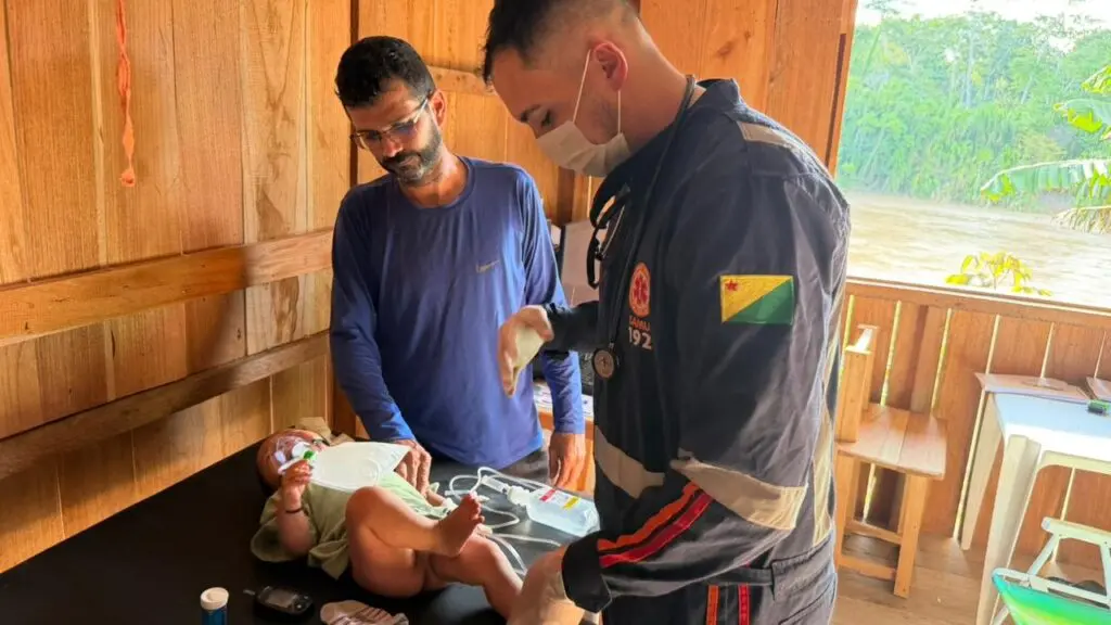 Ao chegarem à terra indígena em Feijó, os profissionais encontraram o bebê já sob cuidados preliminares da equipe de saúde da Funai. Devido à gravidade do quadro respiratório, a equipe médica do Samu realizou procedimentos de estabilização ainda em solo, incluindo a canalização de acesso venoso para medicação imediata.
