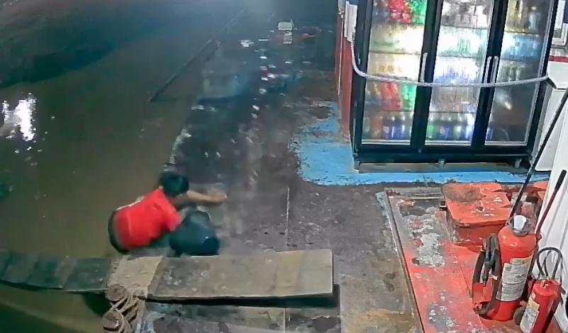Câmeras de segurança instaladas no local registraram o momento do acidente. Nas imagens, o jovem chega ao pontão e, ao tentar acessar o trapiche, escorrega e cai na água, sendo rapidamente levado pela correnteza.