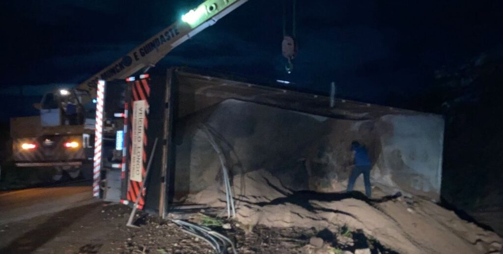 Após perder a estabilidade, o veículo ficou atravessado na pista, bloqueando totalmente a passagem de veículos nos dois sentidos. A carga transportada aumentou a complexidade da ocorrência, dificultando a retirada da carreta.