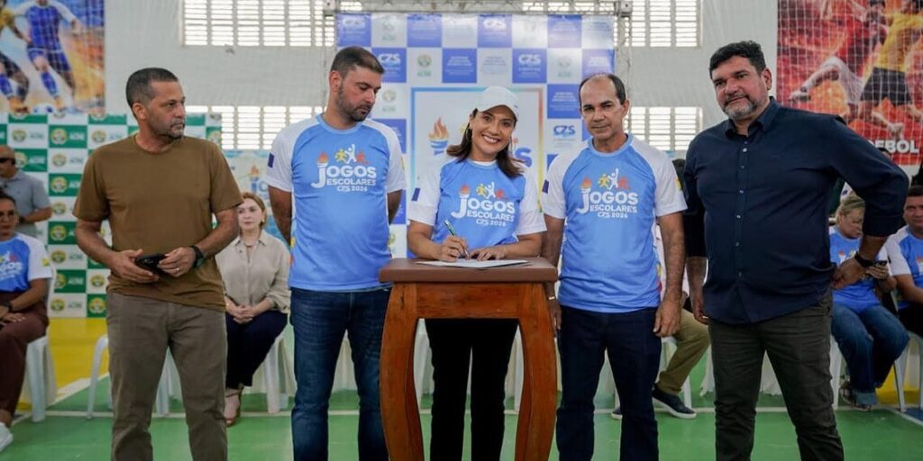 A assinatura ocorreu durante a abertura dos Jogos Escolares 2026, realizada no Ginásio Jader Machado, onde também foram entregues mais de 23 mil kits escolares para estudantes das redes municipal e estadual.