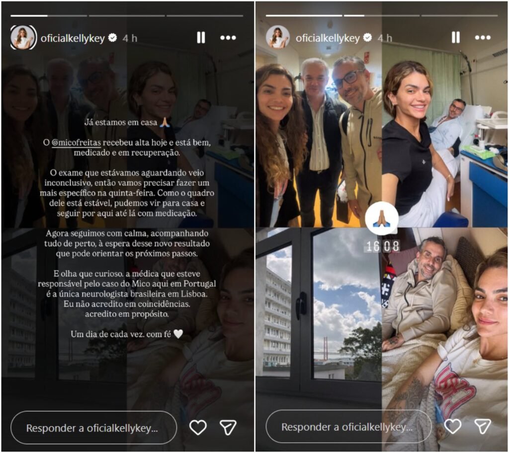 Mico Freitas, marido de Kelly Key, recebeu alta médica nesta quinta-feira, 9, após sofrer um AVC em casa. A cantora compartilhou a informação com seus seguidores no Instagram e explicou que o empresário seguirá com medicação em casa.
