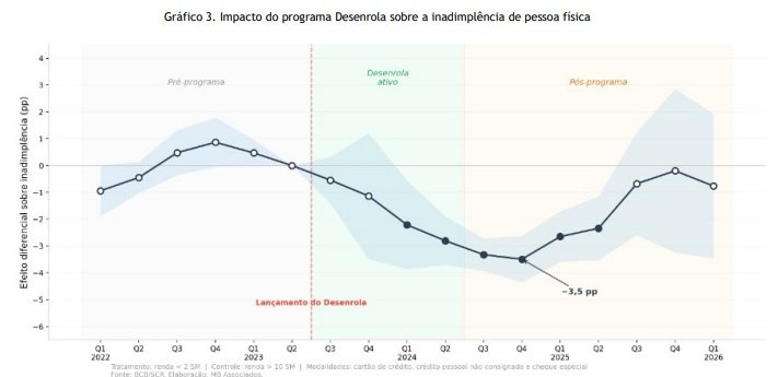 A avaliação é que o Desenrola 1.0 produziu uma redução estatisticamente significativa e economicamente relevante na inadimplência das famílias de baixa renda. Só que o efeito foi temporário e se dissipou em 18 meses após o lançamento, com a inadimplência retornando e até chegando a superar os níveis pré-programa. Não à toa a deterioração observada em 2025 e no início de 2026 reforça essa interpretação, destaca o estudo.