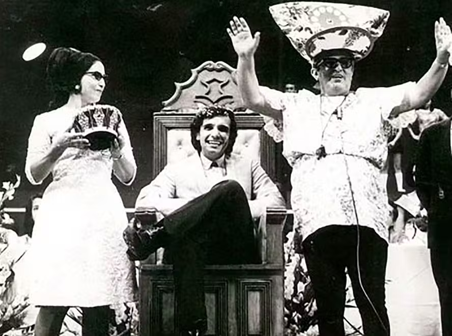 Ao lado de Lady Laura, Roberto Carlos recebe de Chacrinha o título de Rei da Juventude, em 1966 — Foto: Reprodução/arquivo
