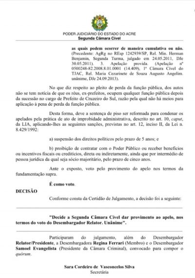 Apesar da vedação imposta pelo Tribunal de Justiça do Acre, portanto uma decisão de segunda instância, o governador Gladson Cameli (PP) já anunciou que acomodará Sales no primeiro escalão de seu governo, provavelmente na Secretaria Extraordinária de Articulação Política.